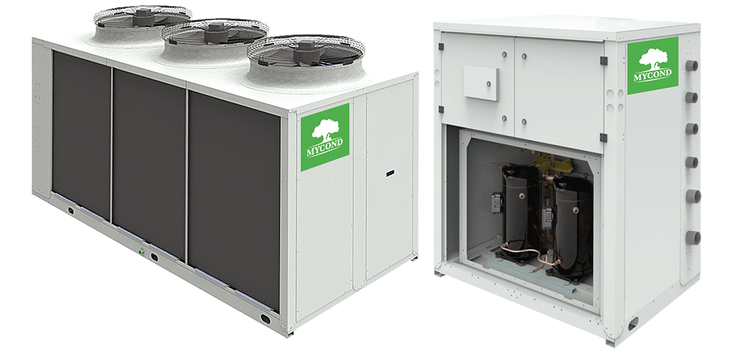 Heat pumps consist of two sections which are interconnected by a freon line. Compressors are installed in the inner section. This equipment can operate at ambient temperatures down to -20 °C and produce hot water up to +65 °C.